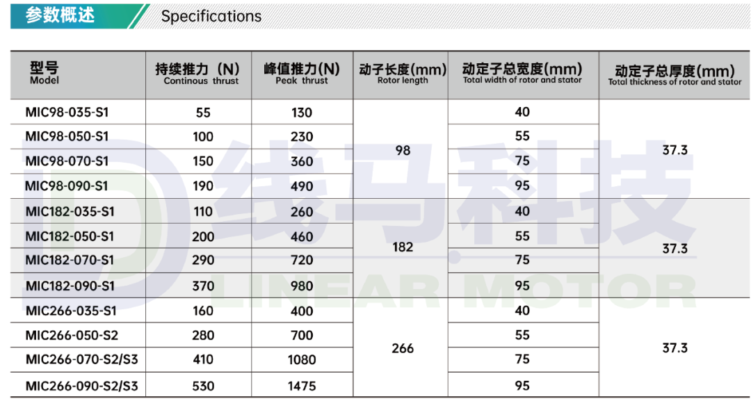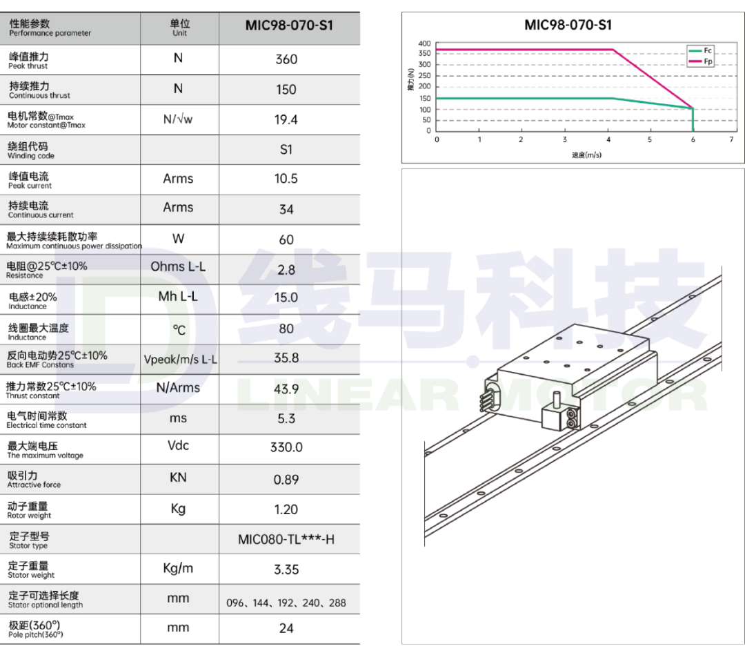 这两者要同时满足。其中最大速度可以通过提高供电电压来适当提升。而直线电机的推力作为直线电机的最重要参数之一,我们一般会清晰直观地标注在电机的性能参数表上。
